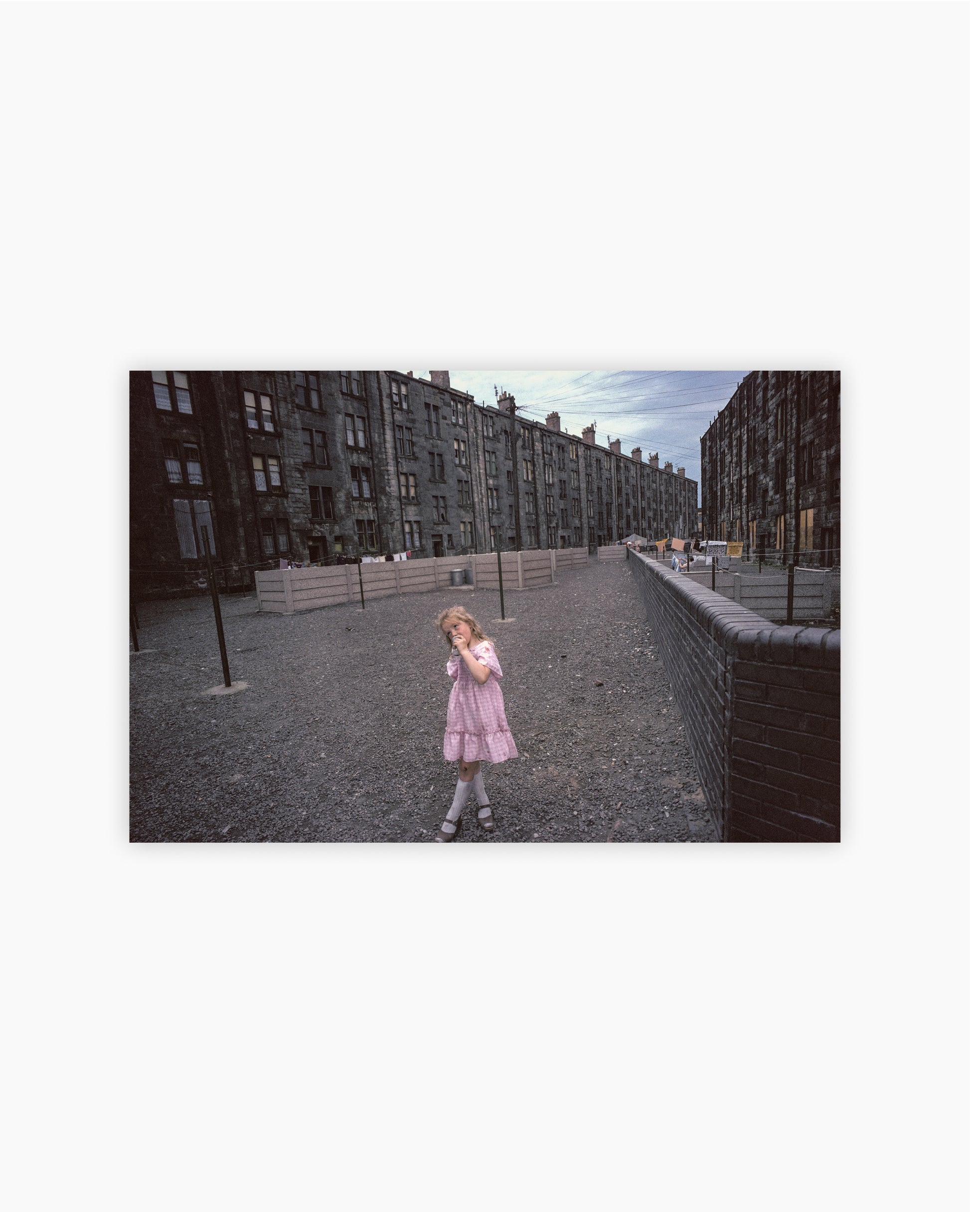 In 1980, Raymond Depardon was commissioned by The Sunday Times Magazine to photograph Scotland’s largest city: Glasgow, on the River Clyde. The city has long been known for its architectural heritage – from its majestic Victorian squares to stern rows of tenements and brutal industrial giants – much of this building being the product of the city’s great Victorian-era wealth. However, in spite of this prosperous past and the city’s pivotal role in Britain’s industrial and cultural development, numerous areas of Glasgow were – at the time of Depardon’s visit – poverty stricken. The photographer focused his work on Glasgow’s famed slums and dock areas, capturing the imposing architecture and broad vistas, as well as the resilient nature of the city’s inhabitants.